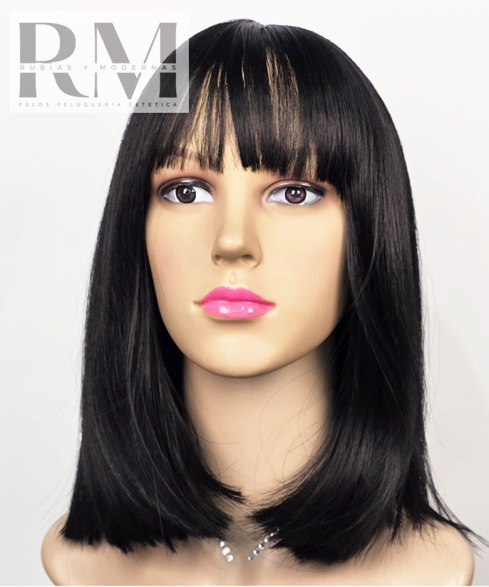 Hermosa Peluca Sintética – Peluca Melena Sintética Color Negra con Chasquilla.